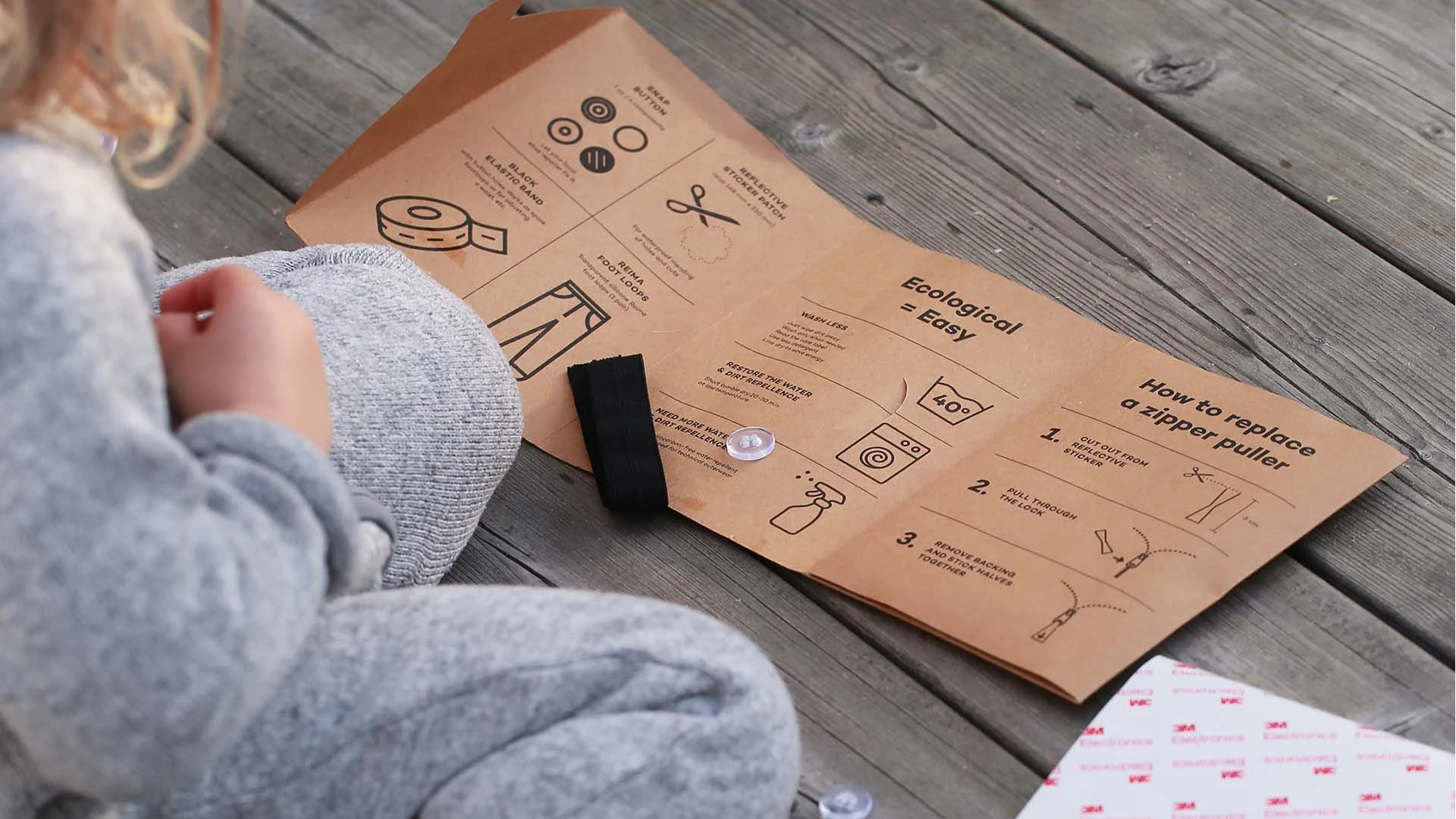 Mending clothes is ecological, and high-quality Reima clothes are well worth it. The Reima Repair Kit offers no-sew fixes and spare parts for tough-tested waterproof gear and foot loops as well.
