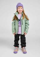 Very light, waterproof and breathable all-weather jacket for kids. 2.5 layer fabric: no lining, yet pleasant and smooth on the inside. Easy to take along, packs into small space.