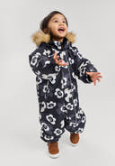 Test winner in 2021: fully waterproof toddler's snowsuit with a detachable faux fur trim on hood. With insulated seat.